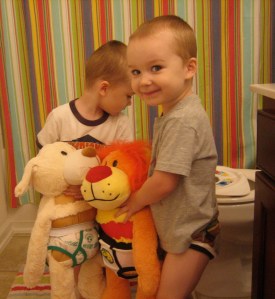the ezzo’s use the principle of letting them teach a doll how to potty and reward their doll and then they will want to do it too.  no dolls are allowed in our house (they creep me out) so we used puppy and lion that cindy strickland bought them for their 2nd birthday.  they loved this! they caught on to pee pee quick…still had an accident here and there when they were busy playing.  the #2 thing they don’t have…they are scared.  so jason bought them 2 diego toys and set them up over the toilet.  “if you go in the toilet you get these”  kinda thing.  i tell you…ben sat on that toilet red faced!  he wanted that diego.